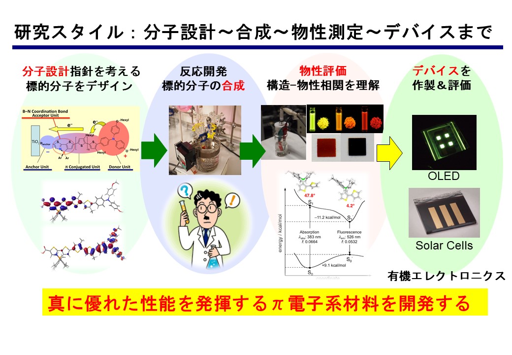 研究スタイルとして図に示すように、特異な分子構造や元素の特性を巧みに利用した独自の分子設計を切り口に、モデル化合物群を合成し、これらの基礎特性評価を通して、π電子系化合物の構造-物性相関の解明に取り組んでいる。さらに、単に基礎特性の解明に終わらず、自ら開発した材料を用いて実際に太陽電池などの有機エレクトロニクスデバイスを作製し、その特性評価までも行なっていることも大きな特徴の一つであると言える。