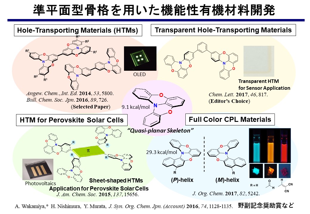 我々の研究の一例を挙げる。有機エレクトロニクス分野で用いられてきたπ電子系分子は、強固な平面性の高い分子が多い。これに対して、我々は、トリフェニルアミン骨格の三つのベンゼン環を二つの酸素で架橋することで構築できる「準平面型骨格」を設計した。骨格をあえて少しねじることで、固体中で分子が真上に積み上がるon top型のπスタック構造を実現できるものと期待した。実際に合成したモデル化合物では、結晶構造中で期待通りの一次元のπスタック構造をもち、これらは有機ELやペロブスカイト太陽電池の有機正孔輸送性材料として機能する。また、本骨格の連結様式を工夫することで、高い透明性と電荷輸送特性を併せもつ材料も開発可能である。さらに、一つのベンゼン環をナフタレン環に拡張すると、骨格の反転障壁が増加し、キラルな化合物として分離できる。これらは、導入する置換基の電子効果により、青色から赤色までの円偏光発光特性を示すCPL材料に展開することもできる。
