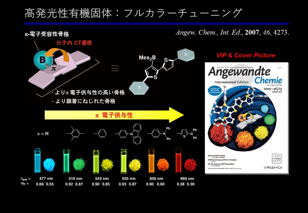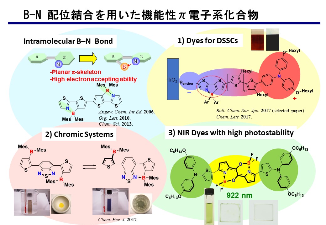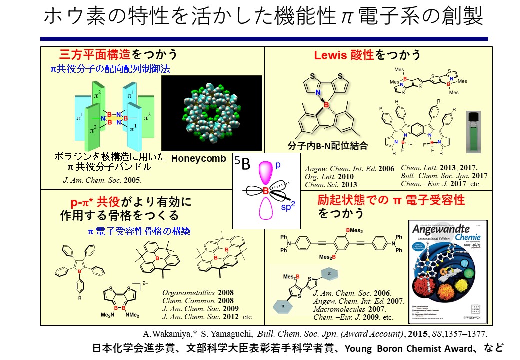 π電子系化合物は、その骨格に基づいたπ電子の共役により、特異な電子的、光学的、および磁気的特性を発現する。これまでに、環状炭化水素、アヌレン、複素環式化合物、およびそれらのカチオン種やアニオン種など、様々な構造をもつπ電子系化合物が合成され、これらに対するHückel芳香族性の実証とともにπ電子系化合物の化学が発展してきた。これらπ電子系化合物がもつ電子的、光学的物性に着目し、これらを巧みに利用することで、有機トランジスタ(OFET)、有機EL(OLED)、および有機系太陽電池(OPV, DSSC、ペロブスカイト太陽電池)など、有機エレクトロニクスの開発研究が急速に発展している。本分野は、化学だけでなく、電子工学、応用物理など様々な分野との融合領域に位置するが、有機エレクトロニクスにおける基盤材料は、π電子系化合物である。すなわち、真に優れた性能を発揮するたった一つの分子の開発が本分野を飛躍的に発展させるといっても過言ではない。その点で新しい物質を創製することができる「化学」に対する期待は大きい。
