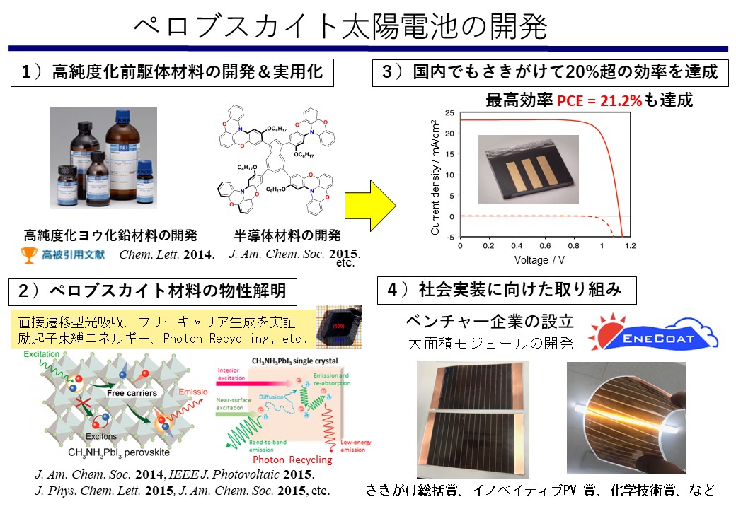 また、近年、ABX3型のペロブスカイト半導体材料を用いた太陽電池および発光素子の開発研究が注目を集めている。我々は、国内でもいち早く本研究を開始し、これらを用いたペロブスカイト太陽電池および発光素子などの光電変換デバイスの高性能化研究を進めている。ABX3型のペロブスカイト半導体材料は、無機材料でありながら、材料の溶液の塗布により薄膜が作製でき、有機半導体材料との共通点も多い。これまでの研究から、その高性能化には、材料の徹底的な高純度化と、溶液からの結晶成長メカニズムに基づいた薄膜作製法の開発が極めて重要であることが見えてきた。また、得られた薄膜に対して、先端分光測定により詳細に物性を解明することにより、これらの材料がもつユニークな特性を明らかにしてきた。さらには、これらの知見に基づいて、独自に開発した有機半導体と組み合わせることで、デバイスをさらに高性能化することも可能である。これらの成果に基づいて、我々は、国内でもさきがけて20%を超える光電変換効率を達成している。2018年には京都大学発のベンチャー企業として、「(株)エネコートテクノロジーズ」を設立し、これらのデバイスの社会実装に向けた取り組みも展開している。