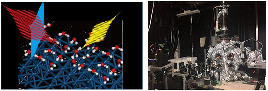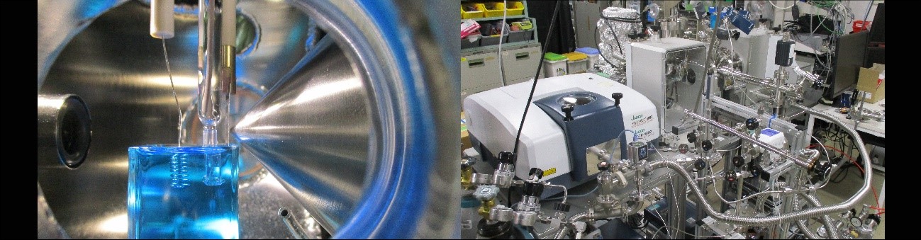 我々の研究室では、固体表面や界面で起きる現象を対象とした実験的研究を展開しています。特に吸着分子の化学反応やそれに伴うエネルギー輸送といった、触媒反応に関わるレアイベントを微視的に理解することを目指しています。界面は様々な微視的変換過程の舞台となりますが、化学結合が切れたり、電子やエネルギーが移動するときに、主役の原子や分子・その周りの媒体はどのような構造・運動状態にあるのか?どのような自由度が反応をドライブするのか?多様な分光実験を基に明らかにしていきます。