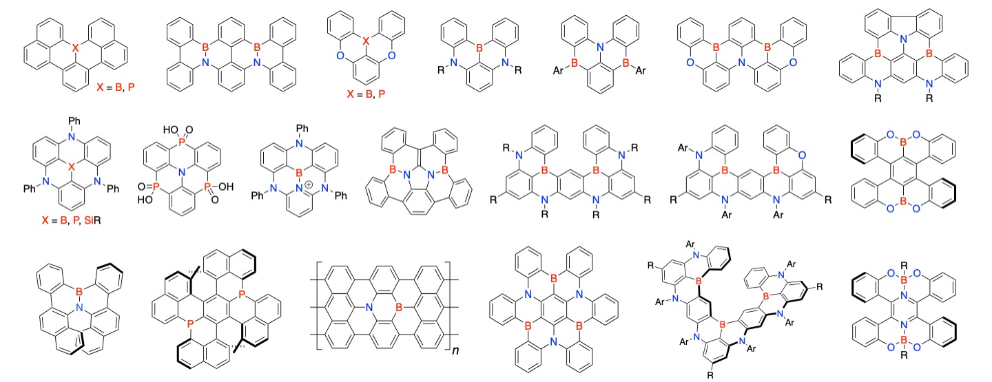 グラフェン・カーボンナノチューブ・フラーレンに代表されるナノカーボンは,次世代の機能性材料として注目を集めている。また,ナノカーボンの任意の炭素をヘテロ元素(ホウ素,窒素,リンなど)に置換した含ヘテロナノカーボンは,理論計算により特異な物性を有することが予測されている。しかし,その合成は,小分子を前駆体として用いた化学気相成長法や,ナノカーボンと小分子との熱アニーリングによるものが主であり,ヘテロ原子の導入位置や導入数の制御が困難であるため,混合物による表層的な材料化学研究に留まっている。このような背景から,本研究室では,含ヘテロナノカーボンの精密合成と,それを通じた学術分野としての深化を目標に据えて研究を進めている。