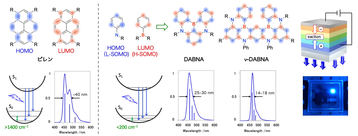 有機発光材料のフロンティア軌道は主として原子間に存在するためS1–S0遷移には結合の伸縮が伴う。その結果,発光スペクトルは伸縮振動との振電相互作用に応じたエネルギー幅を持つことになる。例えば,ピレンなどの多環芳香族化合物は,高い蛍光量子収率を示すために有機ELの青色発光材料として用いられてきたが,剛直な分子骨格にも関わらず,半値幅40 nm前後の幅広な発光スペクトルを示す。これをディスプレイ光源として用いる場合,純粋な青色を得るために不必要な色をカラーフィルターや光学干渉で除去する必要があるが,電力効率や輝度の大幅な低下を伴うという問題がある。これに対し我々は,ベンゼン環上の1,2位にホウ素と窒素を導入し,その「多重共鳴効果」によりHOMOとLUMOを隣接する炭素に交互に局在化させることで,伸縮振動との振電相互作用の完全な抑制に成功した。この設計指針の下で開発した「DABNA」の誘導体は,半値幅25–30 nmの狭帯域青色発光を示すことに加えて,100%近い蛍光量子収率と安定性を兼ね備えていることから,多くのスマートフォンや有機ELテレビに実用されている。更に,無機発光材料を凌駕する超狭帯域発光(半値幅14–18 nm)を示す「ν-DABNA」の開発にも成功した。本材料は,優れた熱活性化遅延蛍光(TADF)特性を有しており,DABNA誘導体を用いた実用素子の2~3倍のエネルギー変換効率も可能となる。